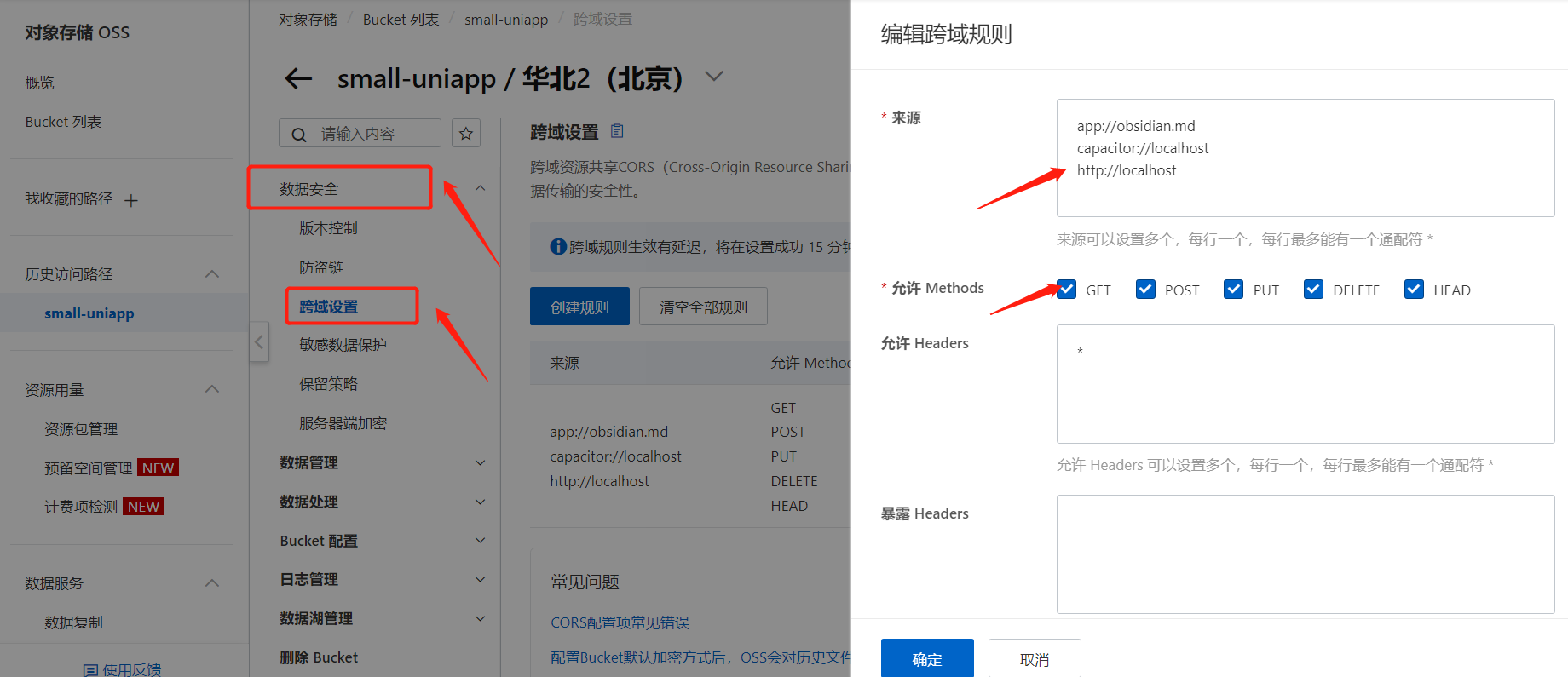 - 跨域设置 - 选择创建规则, 并在 来源 填入如下信息