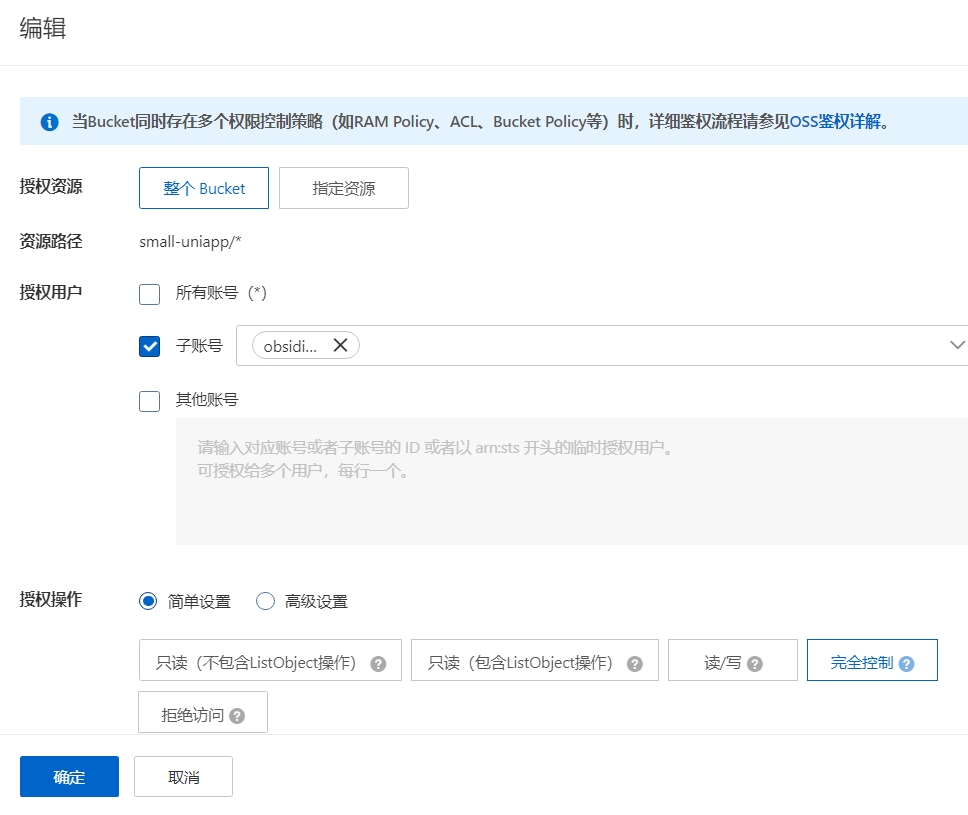 - 给新建的用户授权 - 权限管理 -> Bucket授权策略