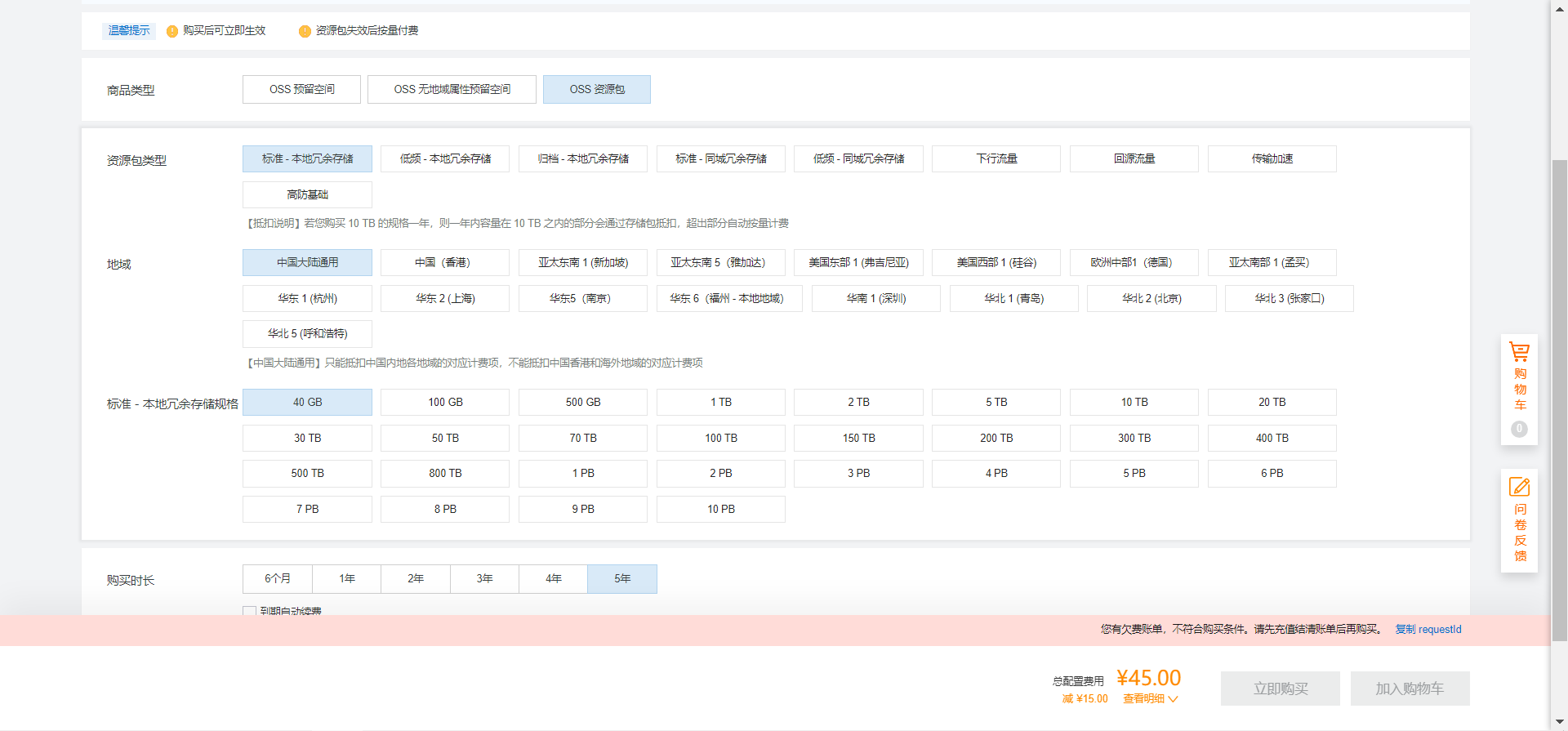 先购入阿里OSShttps://common-buy.aliyun.com/?commodityCode=ossbag&spm=5176.28061389.commonbuy2container.oss_rc_dp_cn_ZjqTabLinks_2.205b778bdeaezx,费用40G,5年45RMB,遇上优惠活动还有更低的折扣,很划算啦啦
