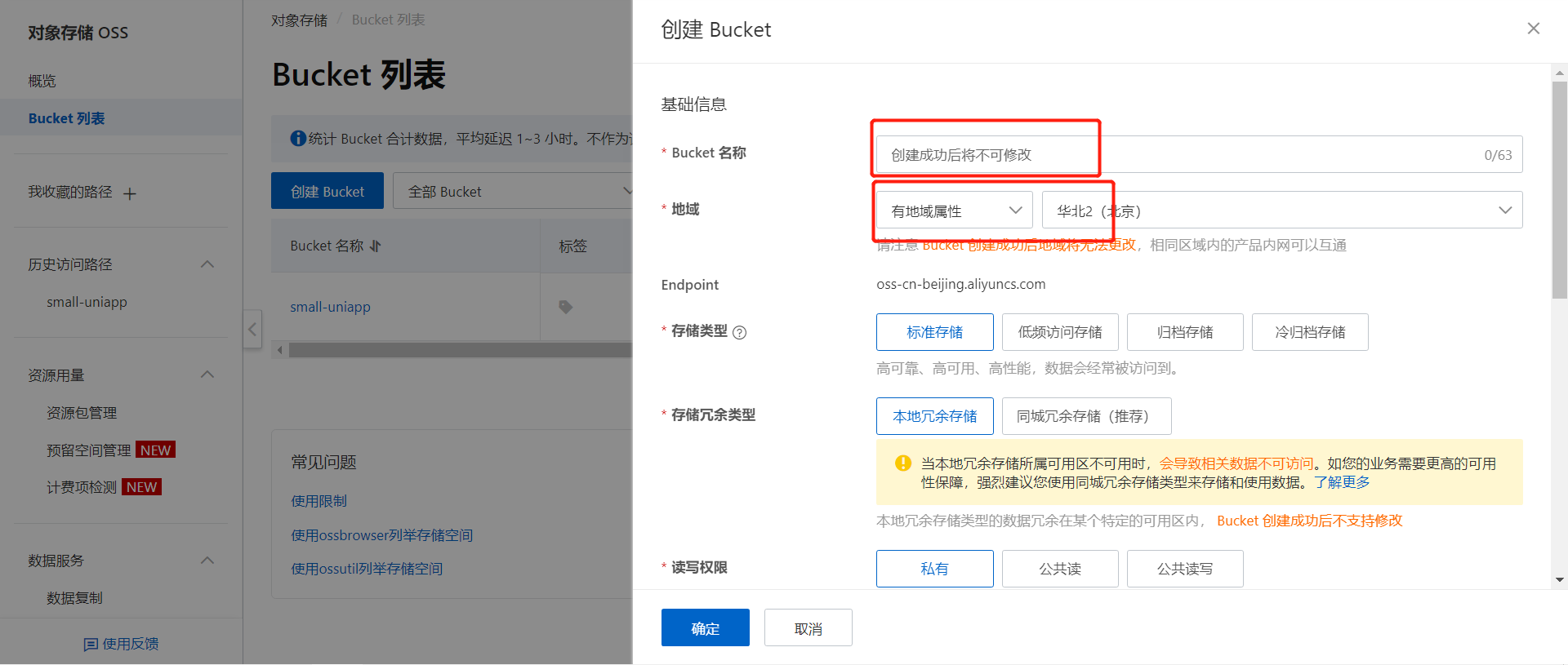 - 进入OSS管理控制台 ,选择[创建Bucket],填写Bucket名称 和 地域(地域选择离自己最近的地方)即可