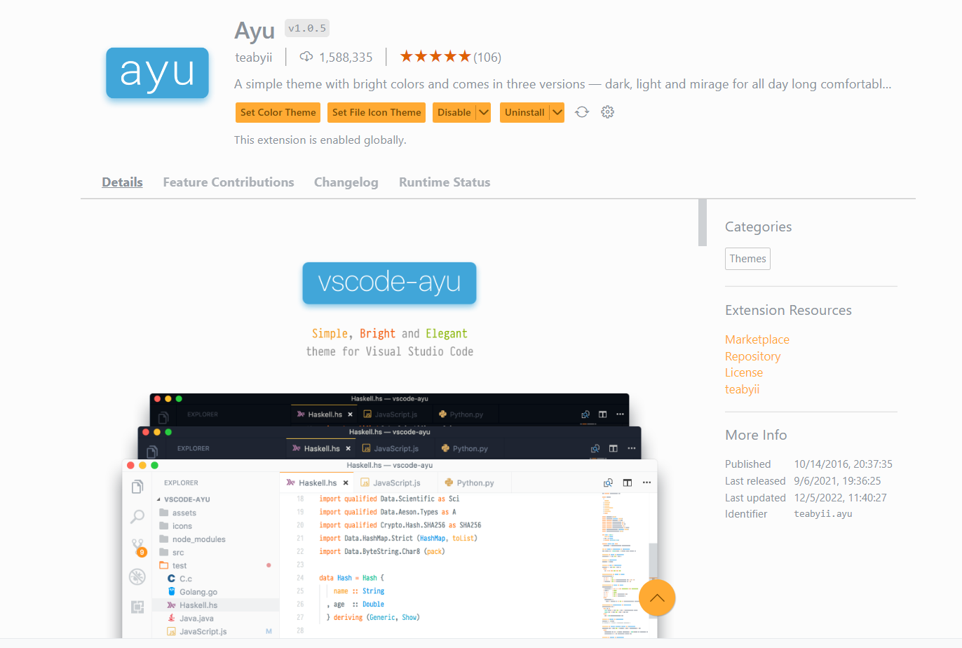 https://marketplace.visualstudio.com/items?itemName=teabyii.ayu