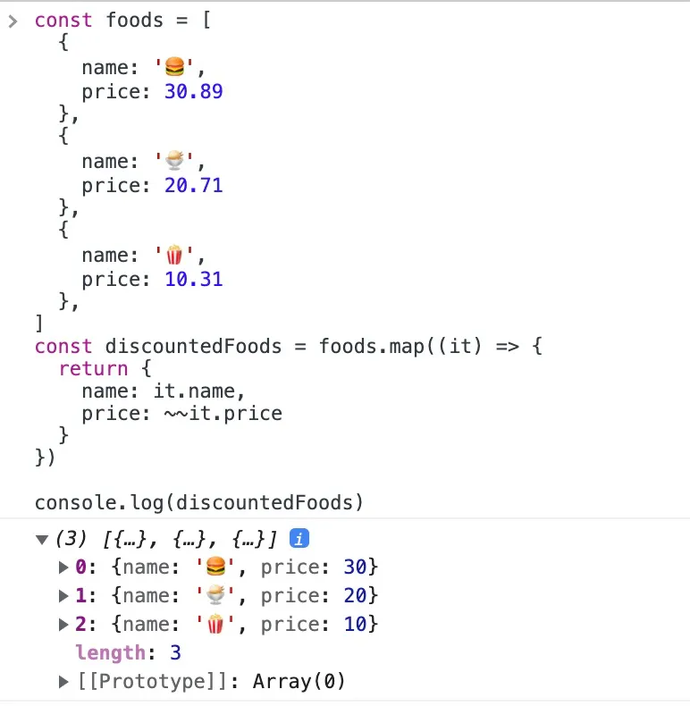 | const foods = [ { name: '🍔', price: 30.89, }, { name: '🍨', price: 20.71, }, { name: '🍿', price: 10.31, }, ]; const discountedFoods = foods.map((it) => { return { name: it.name, price: ~~it.price, }; }); console.log(discountedFoods);
