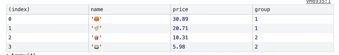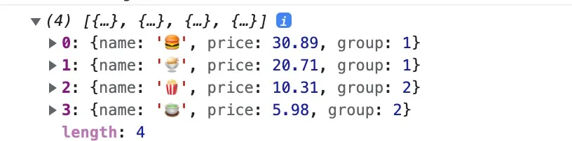 | const foods = [ { name: '🍔', price: 30.89, group: 1, }, { name: '🍨', price: 20.71, group: 1, }, { name: '🍿', price: 10.31, group: 2, }, { name: '🍵', price: 5.98, group: 2, }, ] console.log(foods)