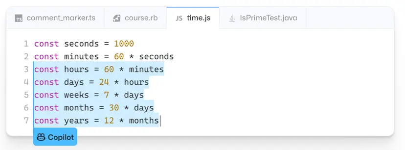 在这个例子中,常量变量以秒为单位开始。一旦第二行显示了将分钟乘以秒的 const,Copilot 就会识别出模式并自动完成代码,包括小时、天、周、月和年。这五行额外的代码可以通过单击一次来编写。在规模上,这将节省大量编程时间,特别是对于较大的块而言