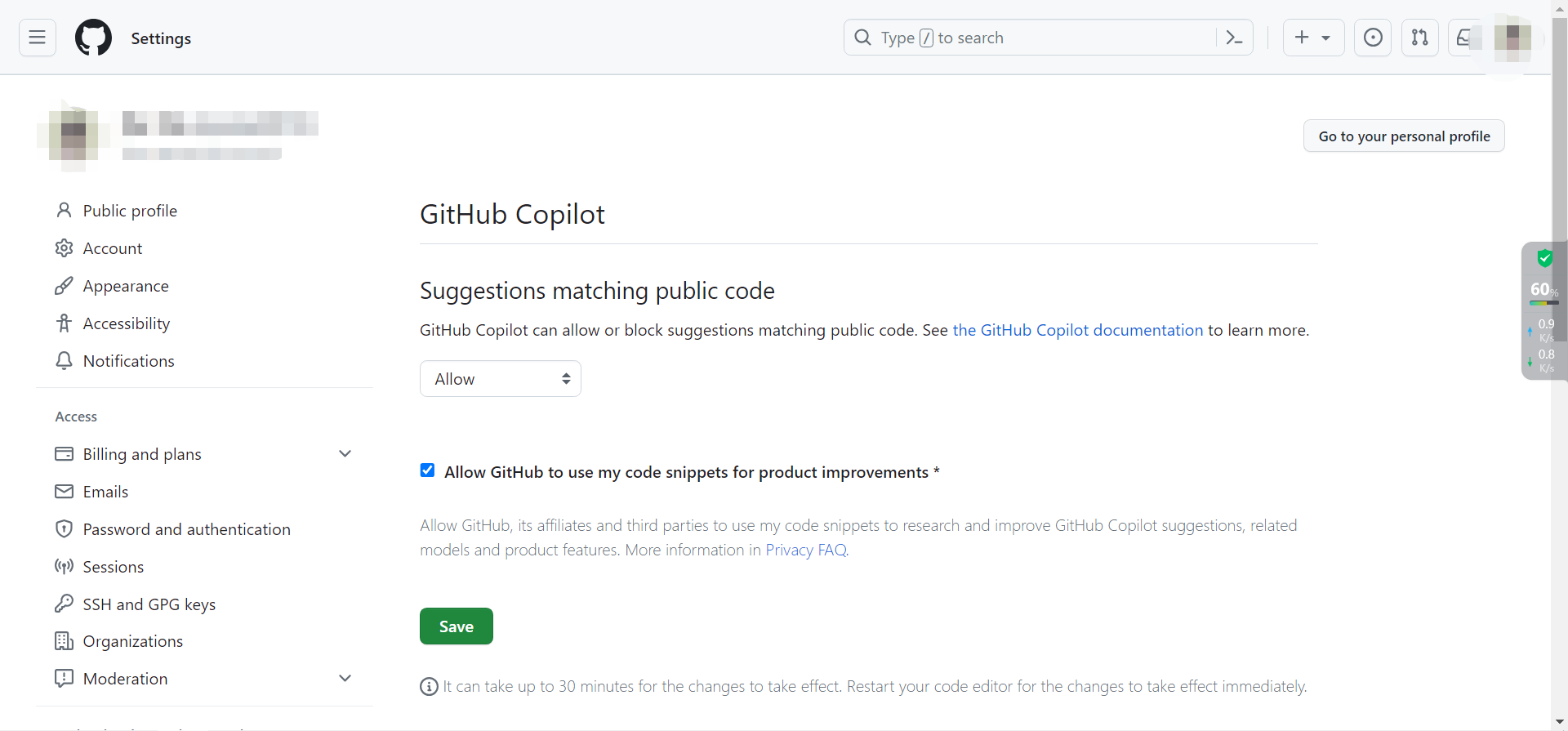 - 在左侧菜单中选择 GitHub Copilot 并勾选 Allow 以启用它,然后单击 Save 按钮以保存。