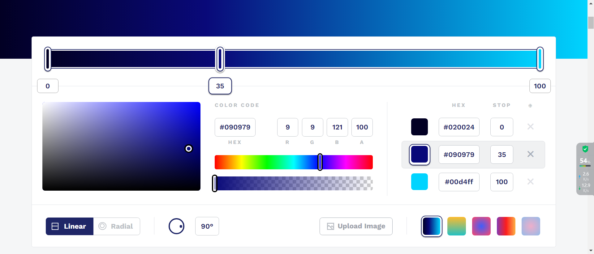 你可以选择和编辑你想要的颜色。该工具为你提供了很多选项来获得你想要的渐变背景并为你的 CSS 生成代码。