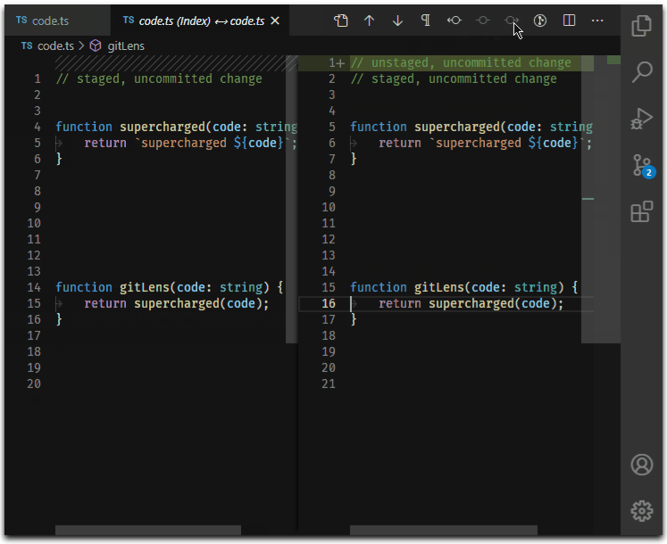 - 代码更改 - 高亮显示任何本地(未发布)更改或最近提交更改的行