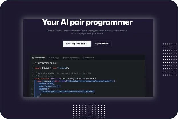 GitHub Copilot 使用 OpenAI Codex,从你的编辑器中实时推荐代码。经过对数十亿行公共代码的训练,GitHub Copilot 将包括注释和方法名称在内的自然语言提示转化为几十种语言的编码建议。