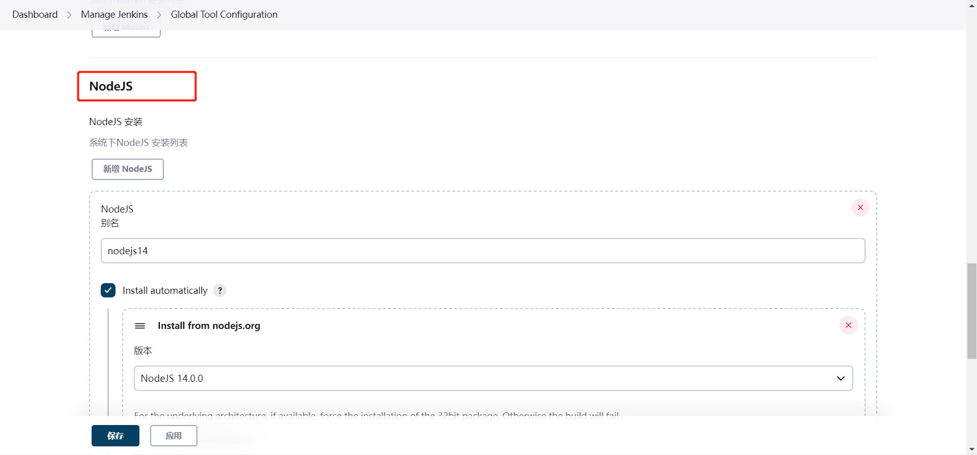 至 Manage Jenkins -> Global Tool Configuration, 配置 NodeJs